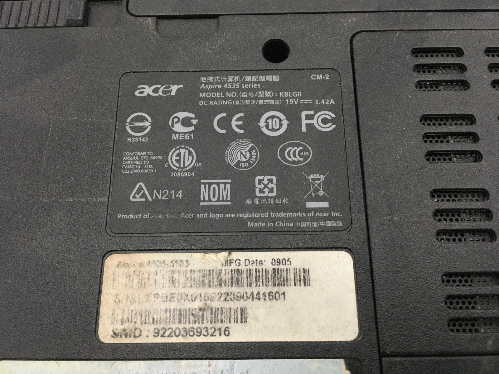 ACER ASPIRE 4535 KBLG0 - FOR PARTS/NO POWER - AMD TURION X2 RM-74 - 2GB RAM - BB