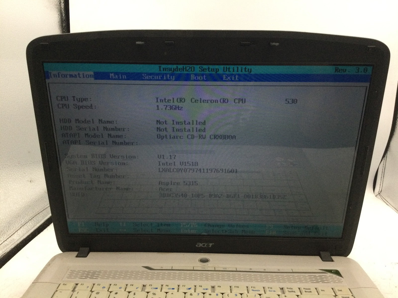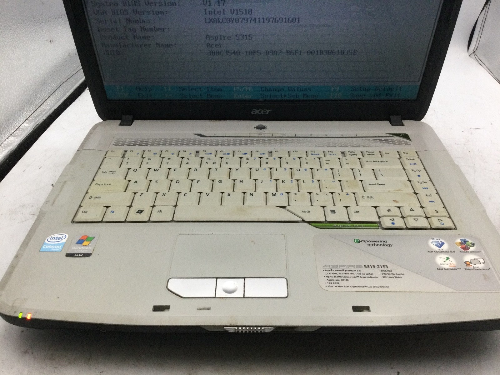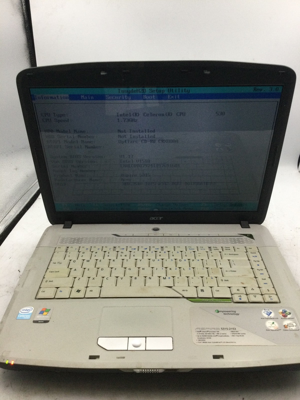 ACER ASPIRE 5315 - BOOTS TO BIOS - INTEL CELERON - 2GB RAM - 15" - READ -BB