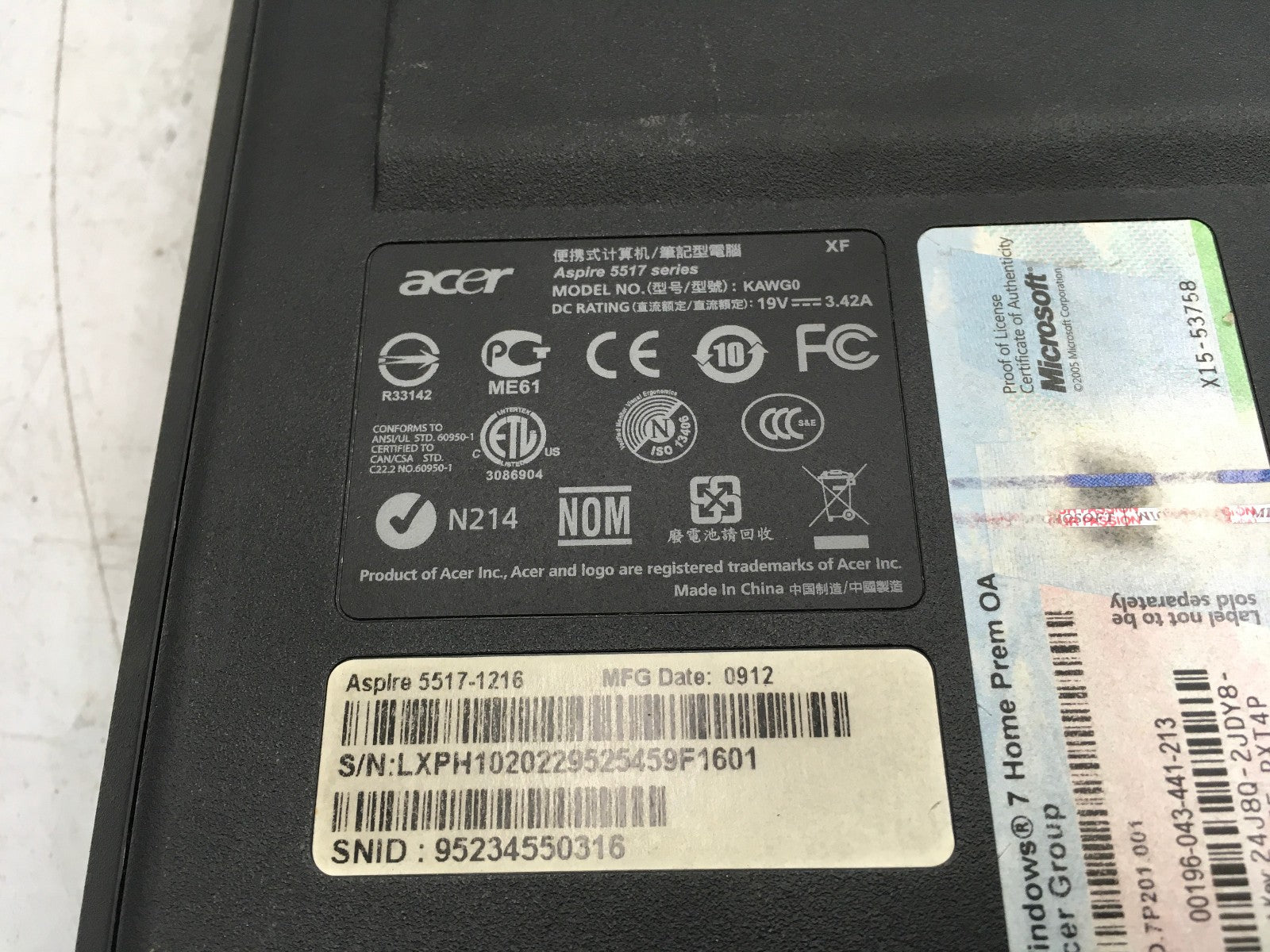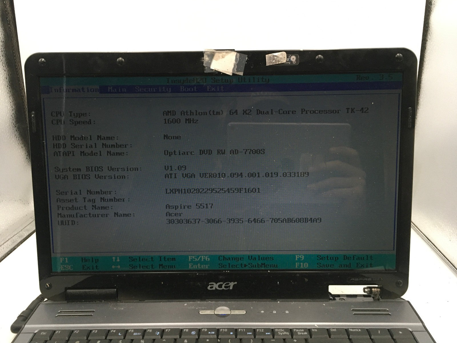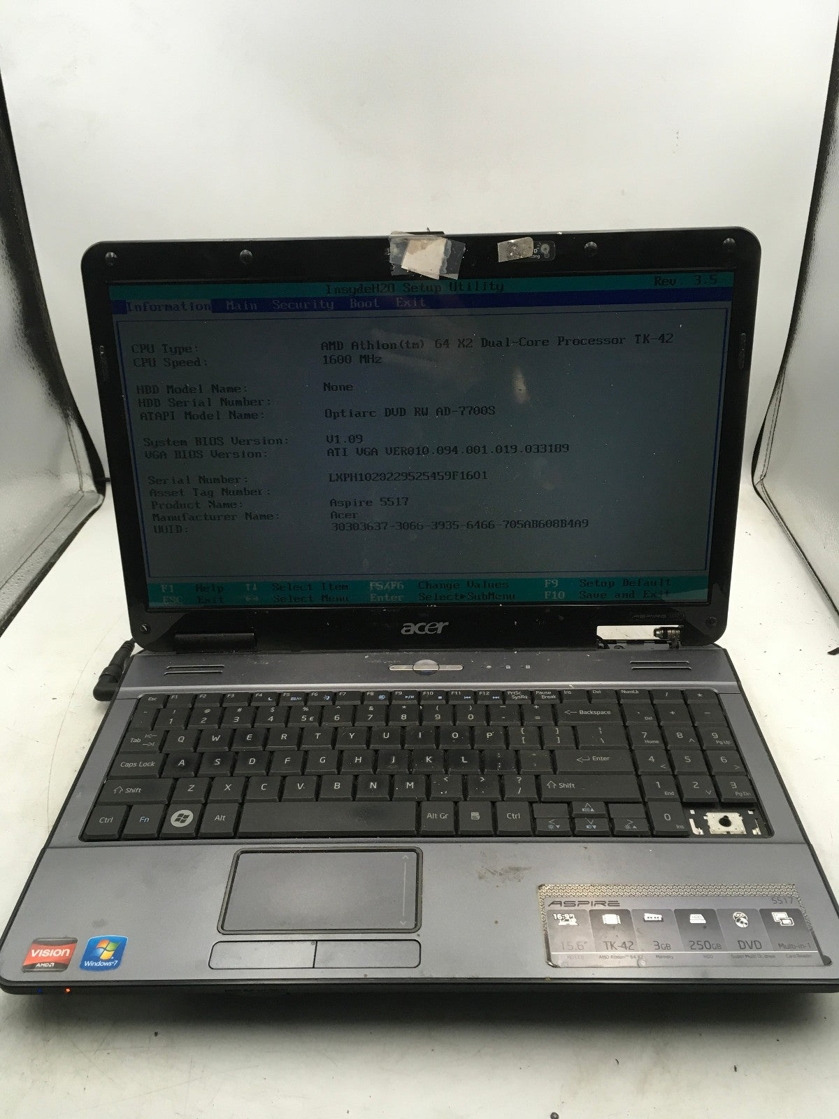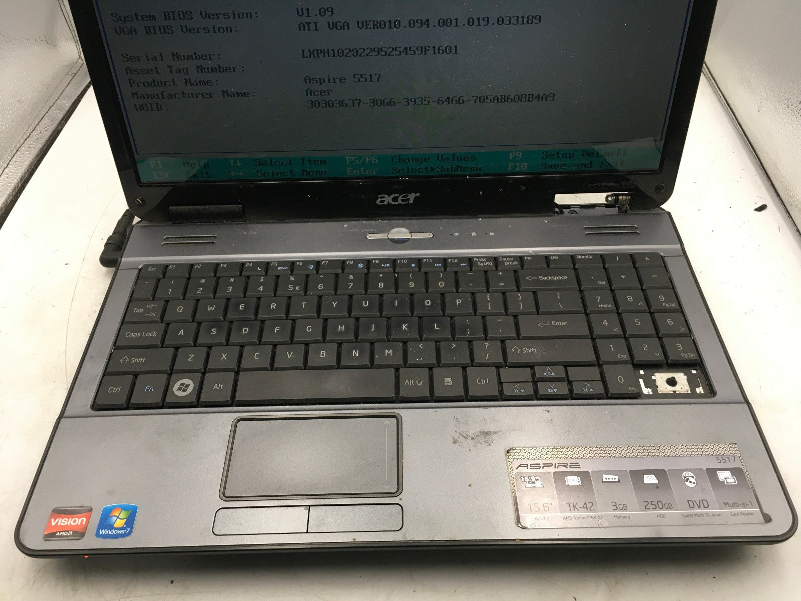 ACER ASPIRE 5517 - BOOTS TO BIOS - AMD ATHLON 64 X2 - 2GB RAM - 15" - READ - BB!