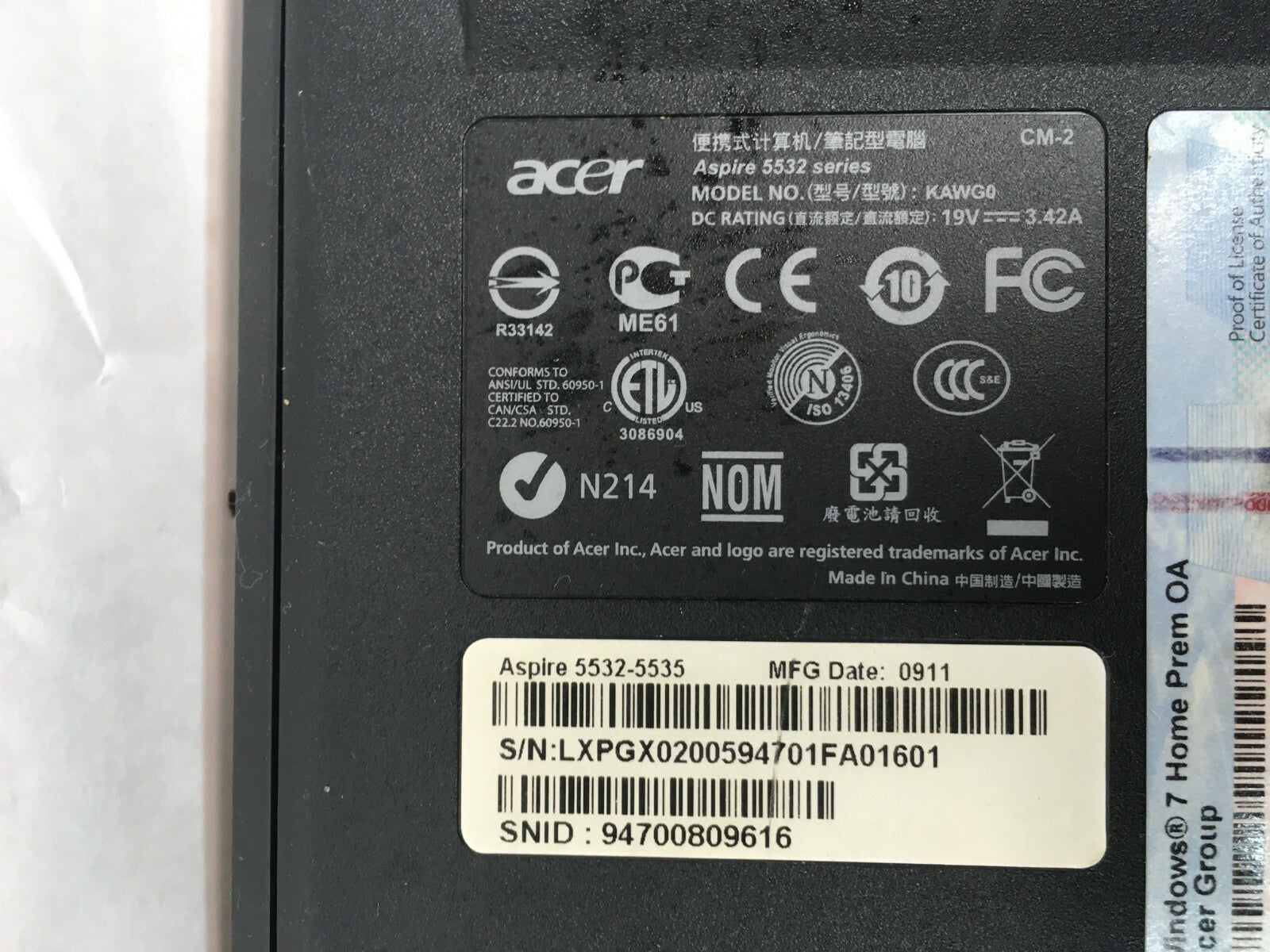 Acer Aspire 5532-5535 Laptop For Parts Powers ON No video NO HDD/RAM/Charger JR