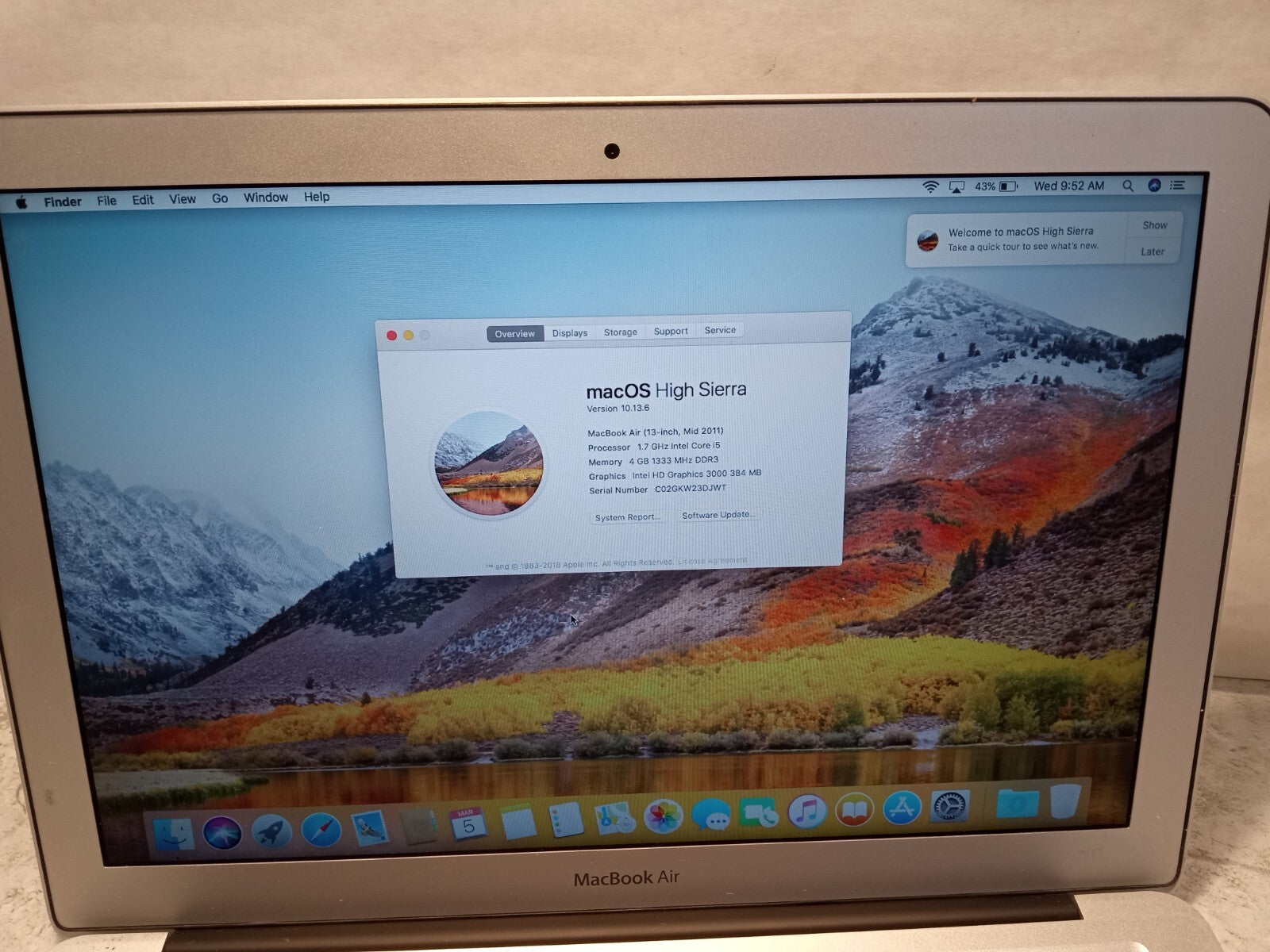 Apple MacBook Air 13" 2011 A1369 Intel Core i5 1.7GHz 4GB 128GB MacOS 10.13 -RR