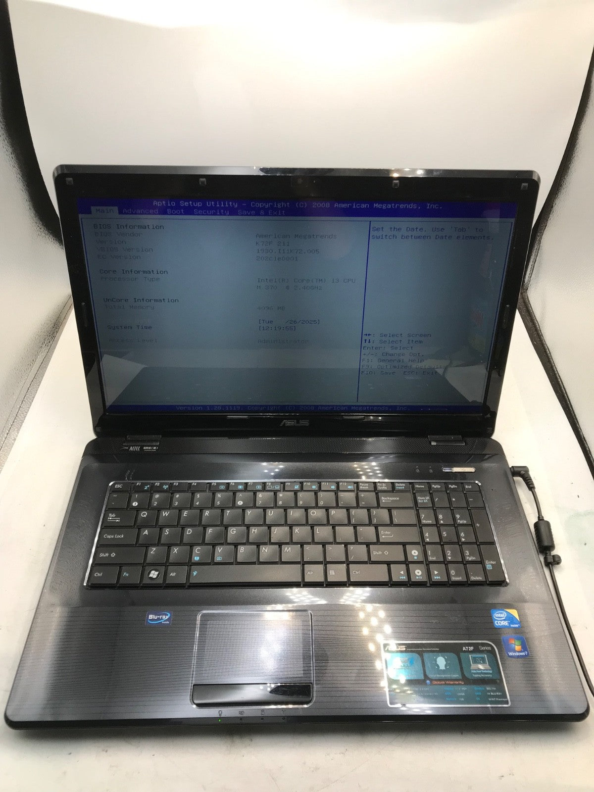 ASUS A72F Intel Core i3-370M 2.4GHz 17" Laptop 4GB RAM-BOOTS TO BIOS -MZ