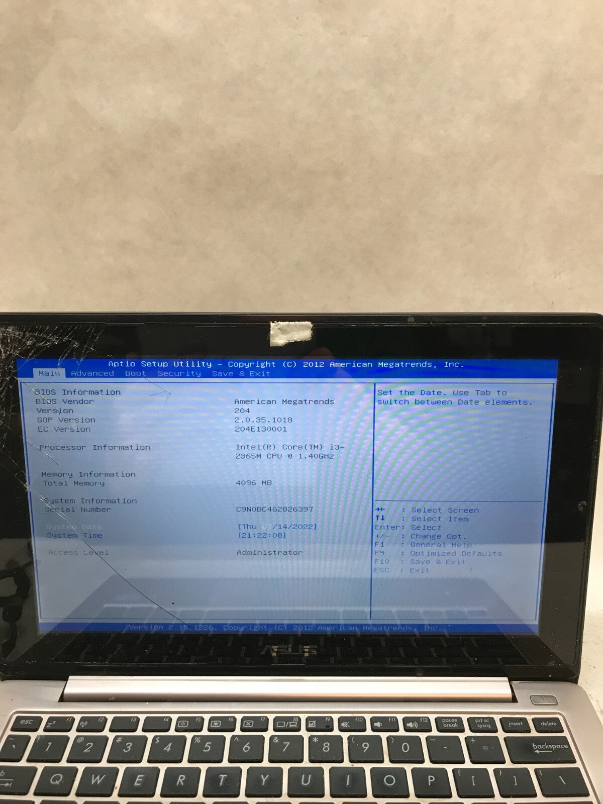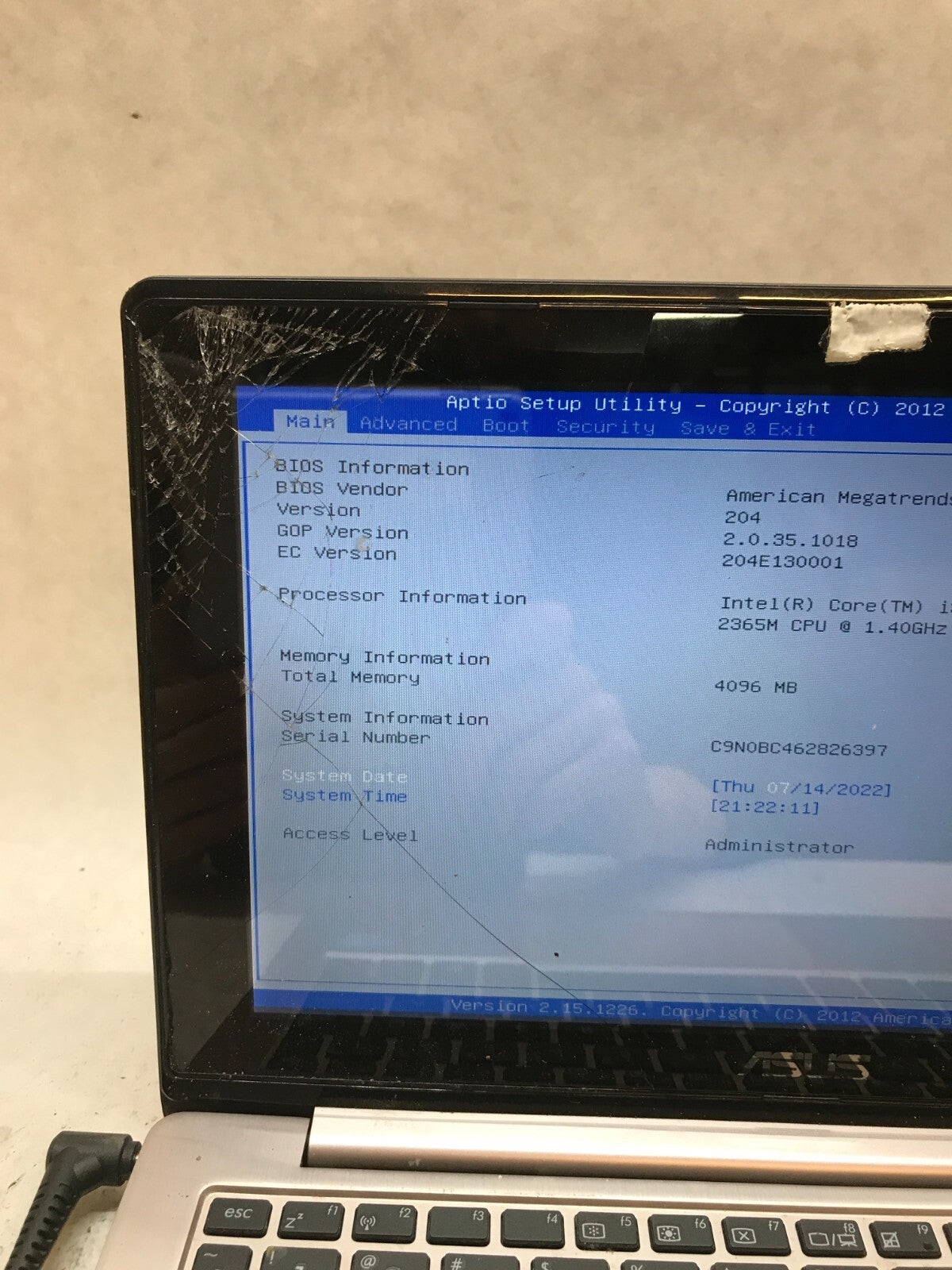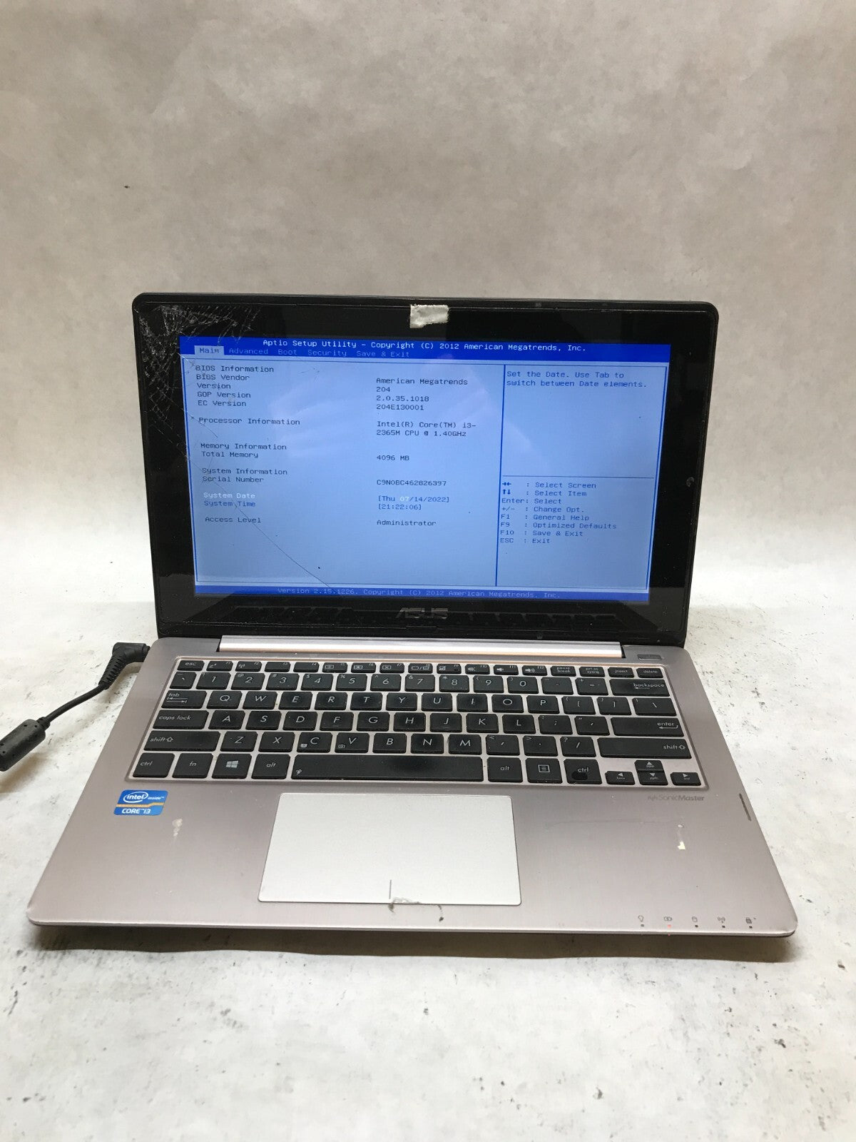 FOR PARTS / REPAIR. MISSING COMPONENTS. Unit powers on and boots into BIOS. Screen is cracked. Fair condition with scratches... Read more