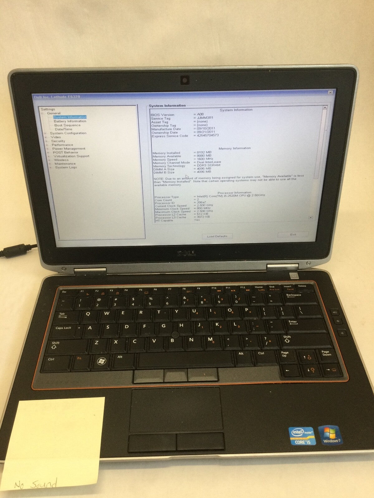 DELL LATITUDE E6320 - INTEL I5 2520M - 8GB RAM - BOOTS TO BIOS - FOR PARTS - BB!