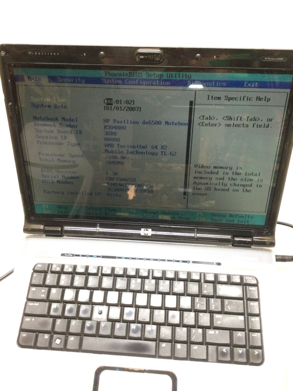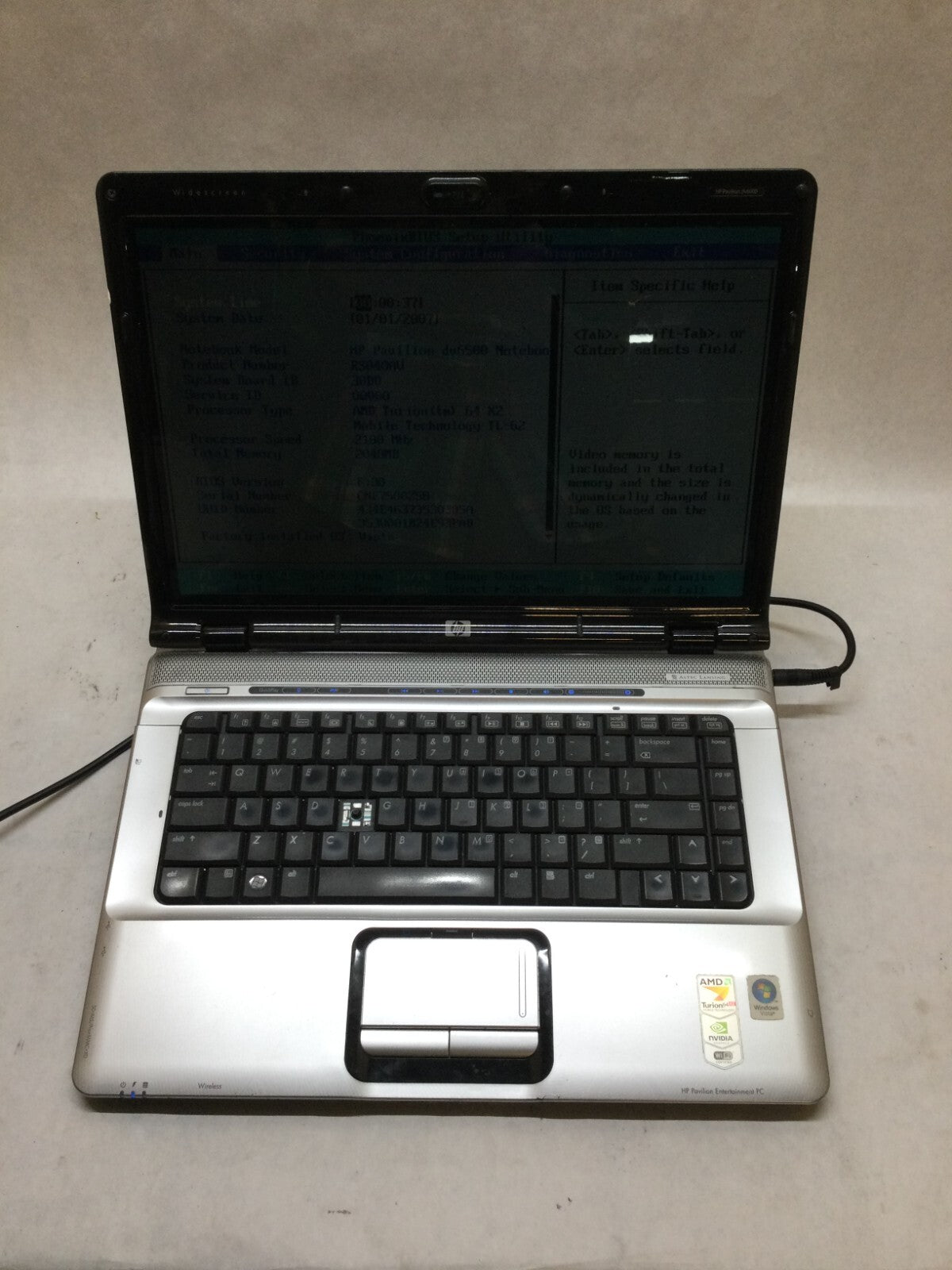HP Pavilion dv6500 Notebook AMD Turion 2.1GHz 2GB RAM NO HDD NO OS For Parts -DW