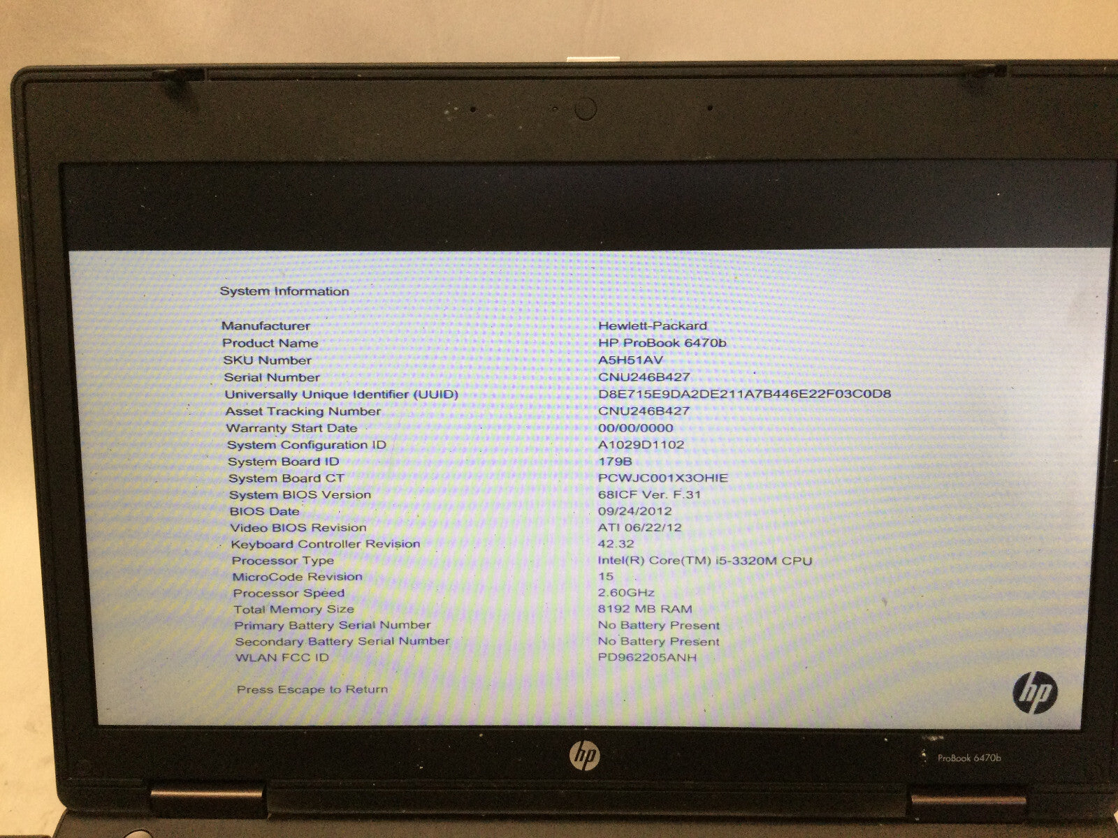 HP PROBOOK 6470B - FOR PARTS - INTEL I5 3320M - 8GB RAM - READ DESCRIPTION - BB!